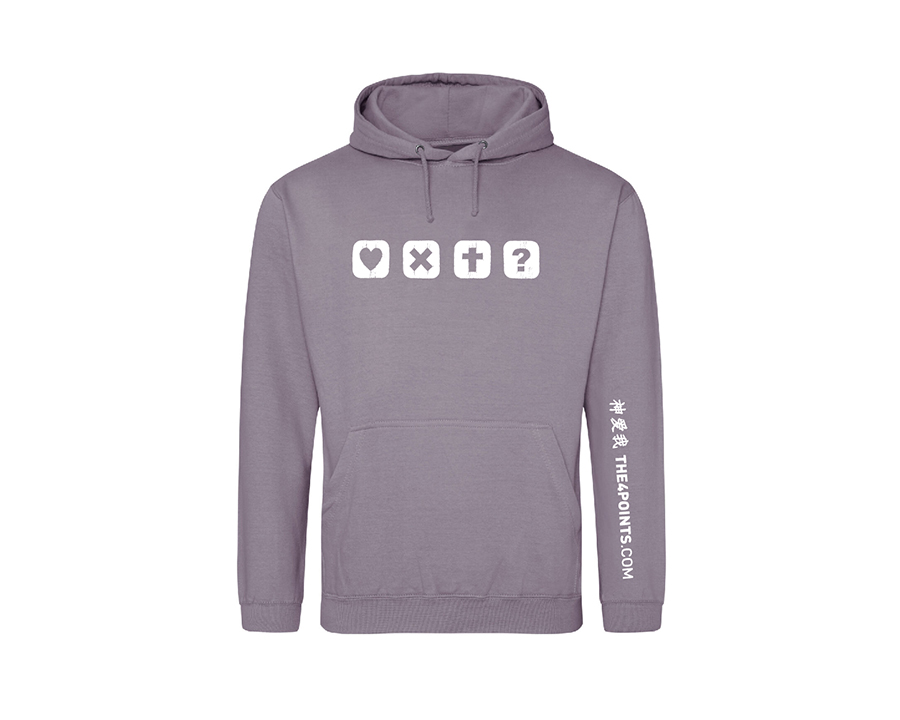 Wear and share the gospel with our very stylish Dusty Lilac Hoodie with distressed white logo, web address and Chinese tag, God loves me, on the sleeve.